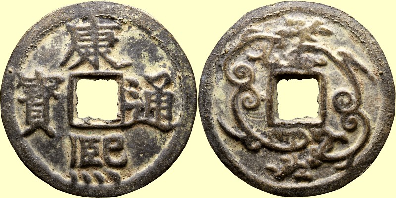 Amulett Av: Kang Xi Tong Bao 康熈通寶 Dies ist die Averslegende der Münzen des Qing Kaisers Kang Xi (1661-1722) Rv: Stilisierte Blumen oder Drachen Material: AE, 27.83g, 46.5mm Literatur:
