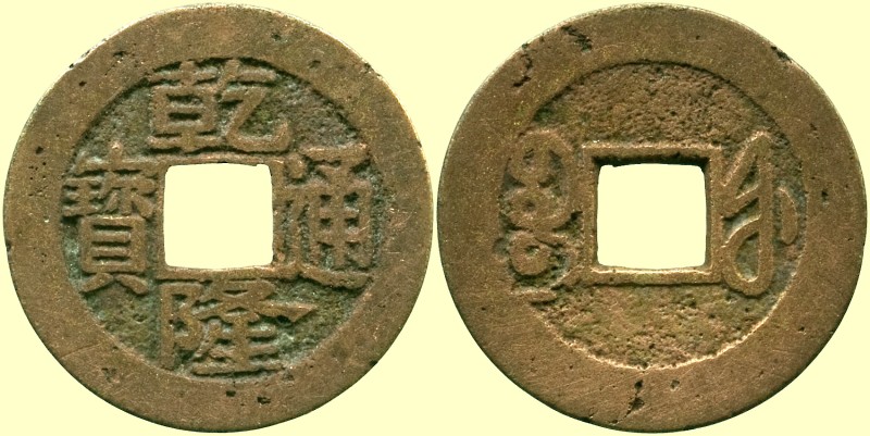 Herrscher: Qian Long (Gao Zong) Münzstätte: Fuzhou, Fujian Av: Qian Long Tong Bao - 乾 隆 通 寶 Rv: Boo Fu Wert: 1 Jahr: 1740-1750 Material: AE, 24.5mm Literatur: Hartill 22.271, FD2314, S1469 Erkennungsmerkmal: ein Punkt Tong geschlossenem Kopf