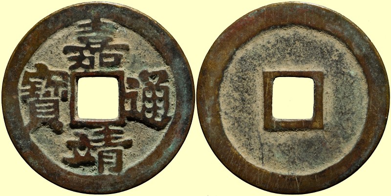 Herrscher: Jia Jing 嘉靖 Av: Jia Jing Tong Bao 嘉靖通寶 Rv: leer Wert: Jahr: nach 1527 Material: AE, 4.36g, 25mm Literatur: Hartill 20.128 Normale Version, FD1962, S1181