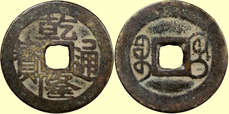 Herrscher: Qian Long (Gao Zong) Münzstätte: Guilin, Guangxi Av: Qian Long Tong Bao - 乾 隆 通 寶 Rv: Boo Gui Wert: 1 Jahr: 1770-1794 Material: Messing, 4.39g, 24.8mm Literatur: Hartill 22.282 Erkennungsmerkmal: Tong mit rechteckigem Kopf