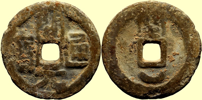 Herrscher: Wang Shenzi 王审知 Av: Kai Yuan Tong Bao 開元通寶 Rv: Min 閩 und Halbmond Wert: Jahr: 909-945 Material: Blei, 20.8g, 39.6mm Literatur: Hartill 15.51, FD 739