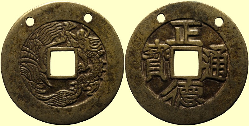 Hochzeits-Amulett Bildseite : Drachen und Phoenix (Symbolisch für Mann und Frau) Schriftseite : 正德通寶 Zheng De Tong Bao, Regierungstitel des Ming Kaisers Wu Zong Material: AE, 52.3mm, 23.68g Literatur: Grundmann 1213 var.