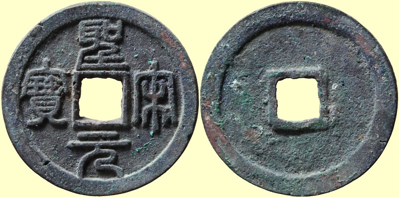 Herrscher: Huizong, 徽宗 Av: Sheng Song Yuan Bao 聖宋元寶 Seal Script Rv: leer Wert: 1 Jahr: 1101-1106 Material: AE, 24.5mm, 3.76g Literatur: Hartill 16.358, FD 1017 var.