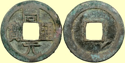 Für die Zhou Yuan Tong Bao 周元通寶 Münzen der Späteren Zhou-Dynastie gibt es eine Vielzahl von Rückseitenvarianten wie Halbmonde, Striche und Punkte in verschiedenen Postionen, von denen hier einige gezeigt werden.