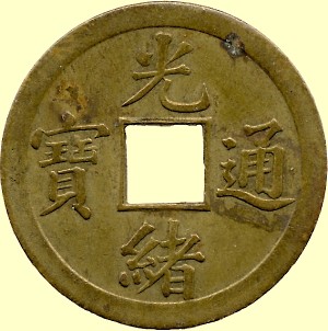 Guang Xu (* 14. August 1871; † 14. November 1908) wurde im Alter von drei Jahren zum Kaiser ernannt. Er stand sein ganzes Leben unter der Vorherrschaft seiner Tante, der Kaiserinwitwe Cixi, die ihn ein Tag vor ihrem eigenen Tod ermorden ließ. Die Münzen sind vielfältig, es gibt die klassischen gegossenen Cash Münzen mit dem Averstext Guang Xu Tong Bao, aber auch geprägte Cash Münzen, und geprägte Münzen ohne Loch.